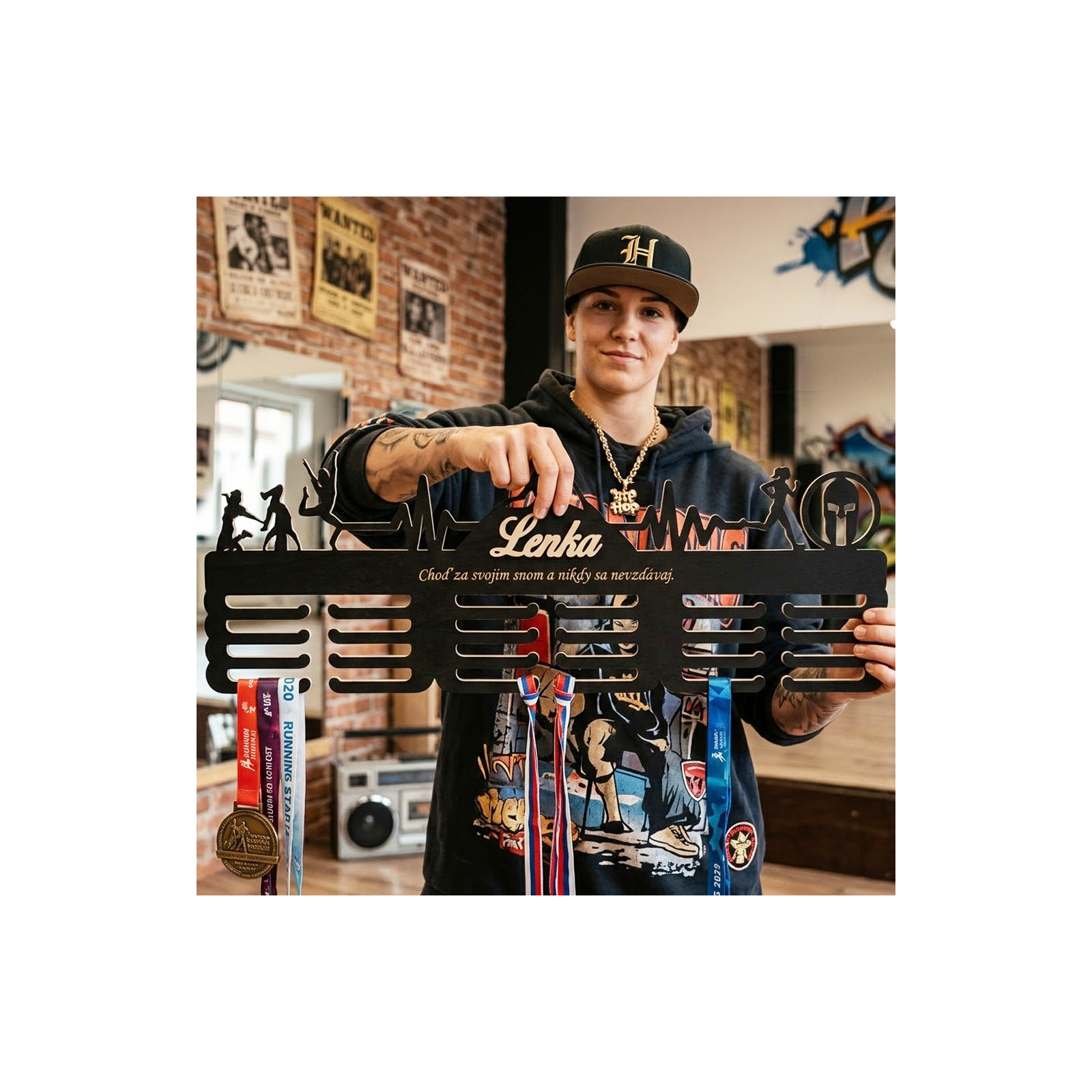 Sportovní úspěchy si zaslouží být patřičně oceněny a vystaveny. Klasické rámy a vitríny už dávno vyšly z módy. Dnes je trendem funkční a stylový doplněk, který nejenže uschová vaše medaile, ale také dodá interiéru šmrnc. Představujeme vám 80 cm dřevěný hanger na medaile s pulsem, vyrobený na míru pro různé sporty, v oblíbené černé barvě.