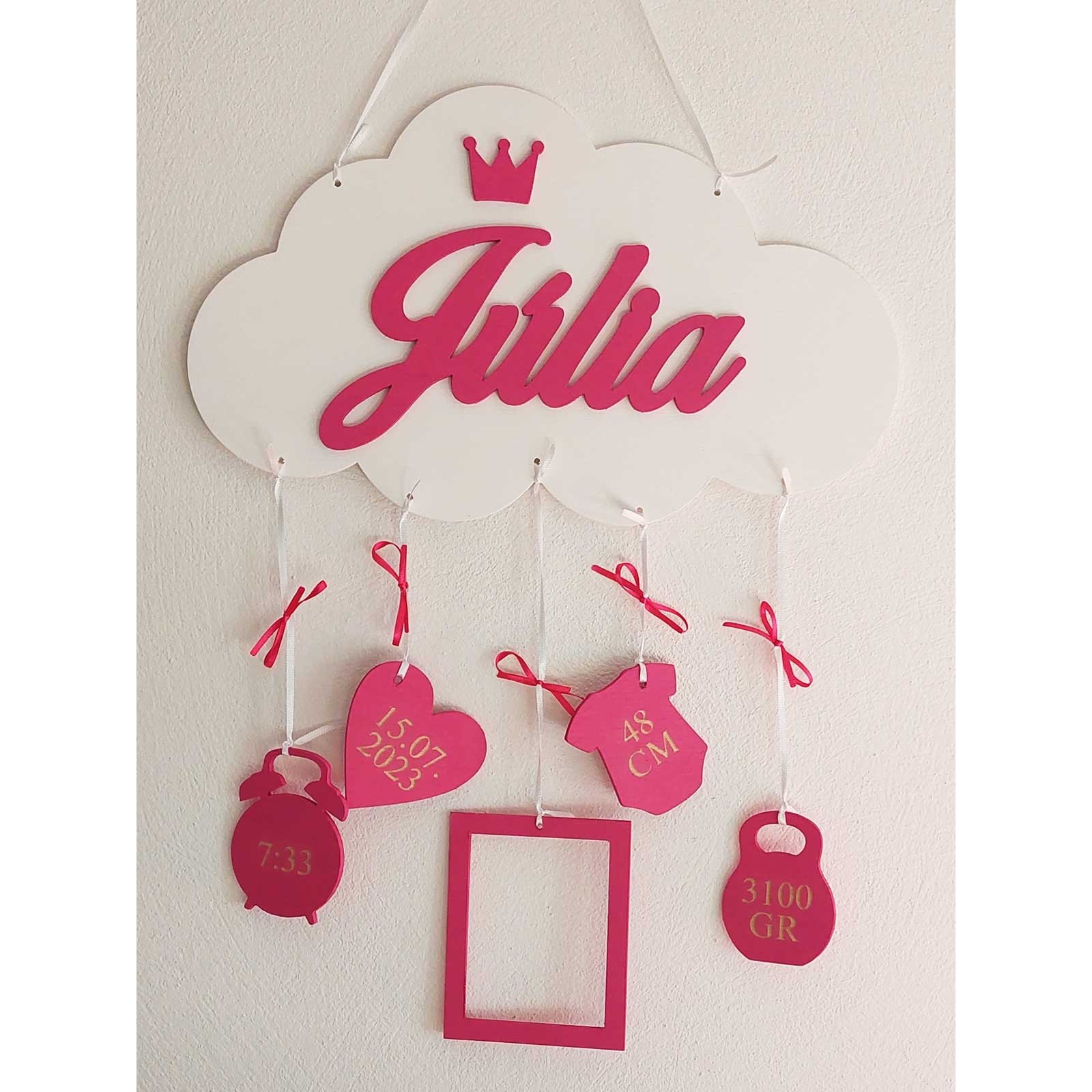 Pokud hledáte něco, co přežije plenky, hračky a drobné oblečení, máme pro vás tip: Personalizované dřevěné jméno na obláčku s údaji o narození. A ideální ve velikosti, která vynikne, například šířka 35 cm.