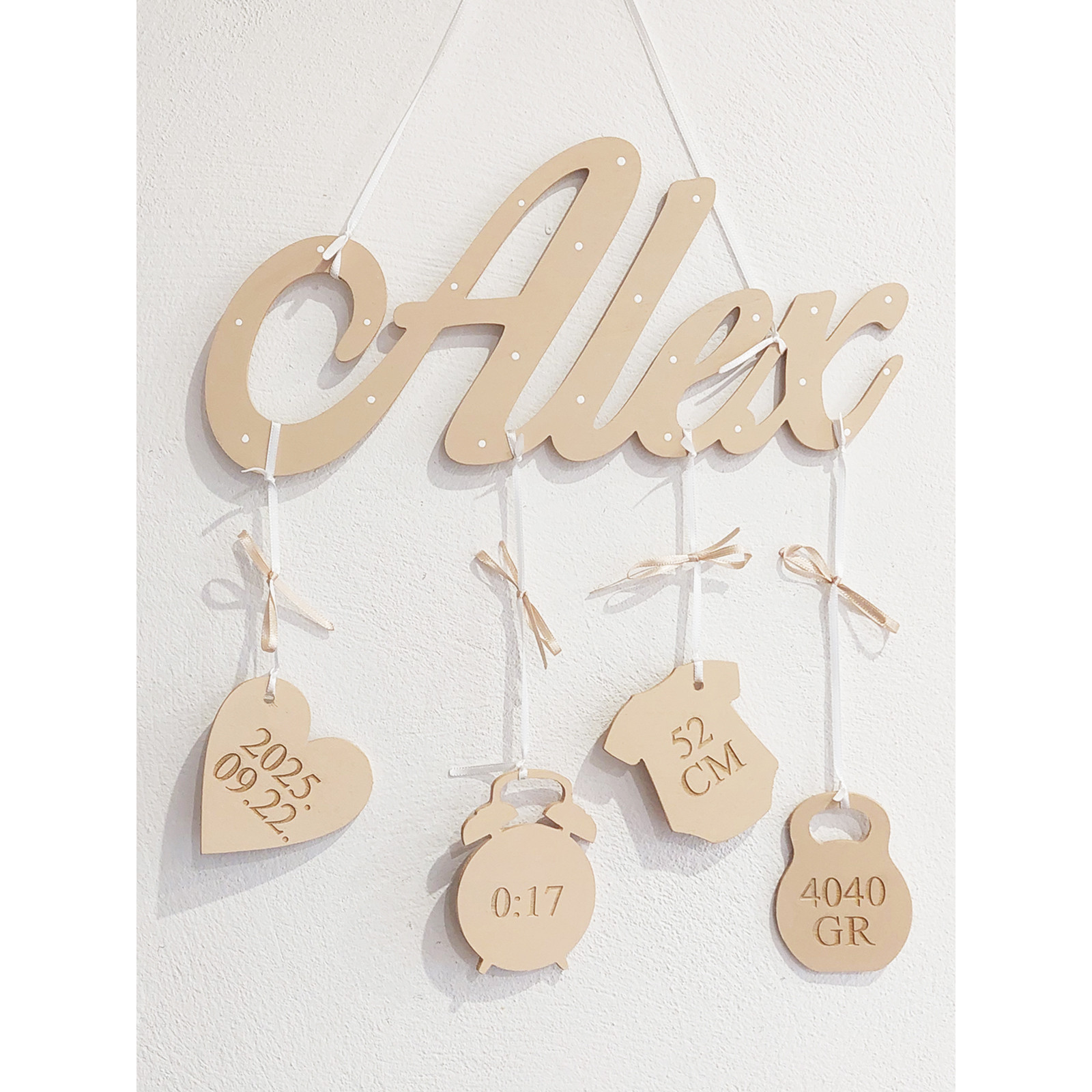 Jméno dítěte na míru s připojenými údaji o narození: Datum - Čas - Délka - Hmotnost.