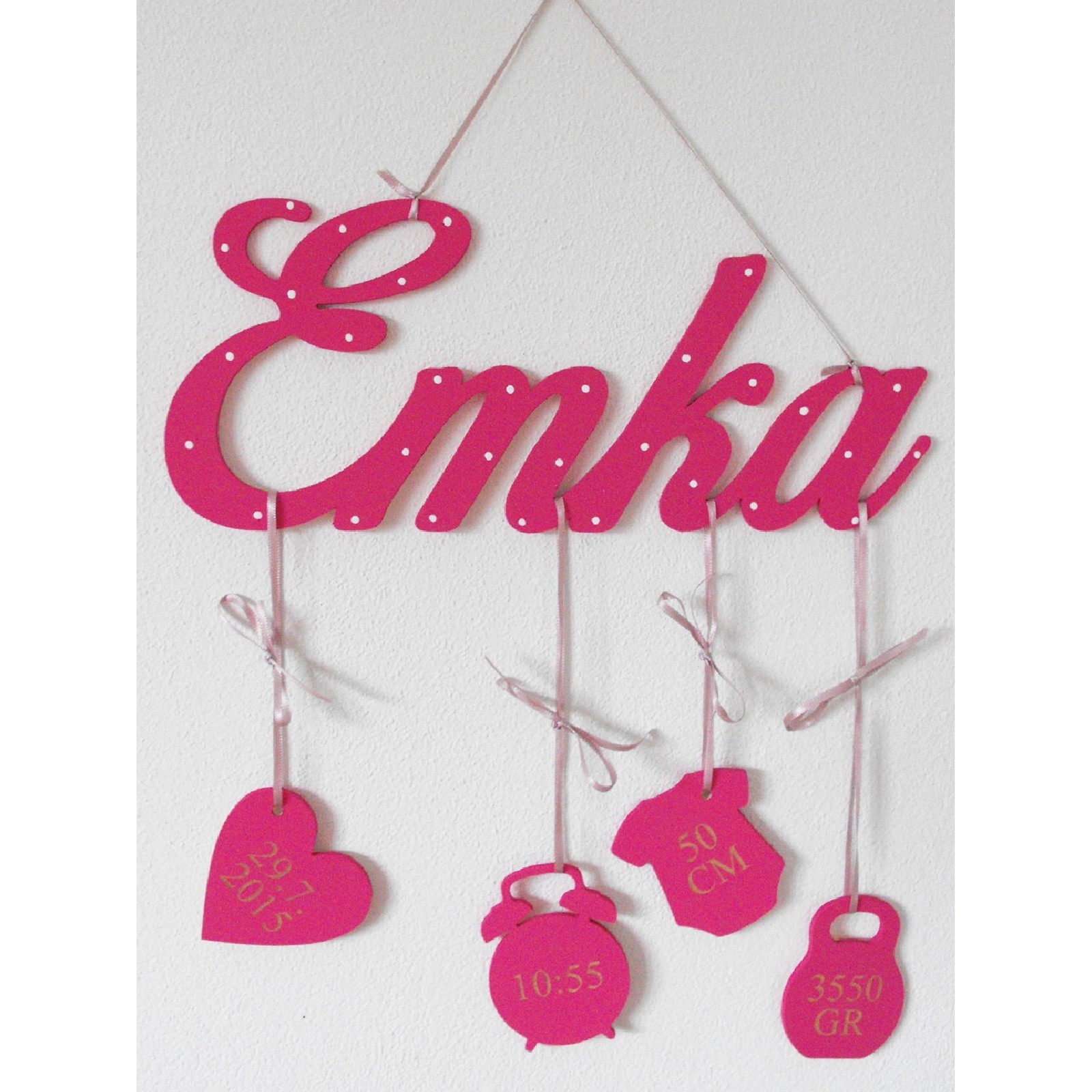 Na míru zpracované jméno dítěte s připevněnými údaji o narození: Datum - Čas - Délka - Váha.