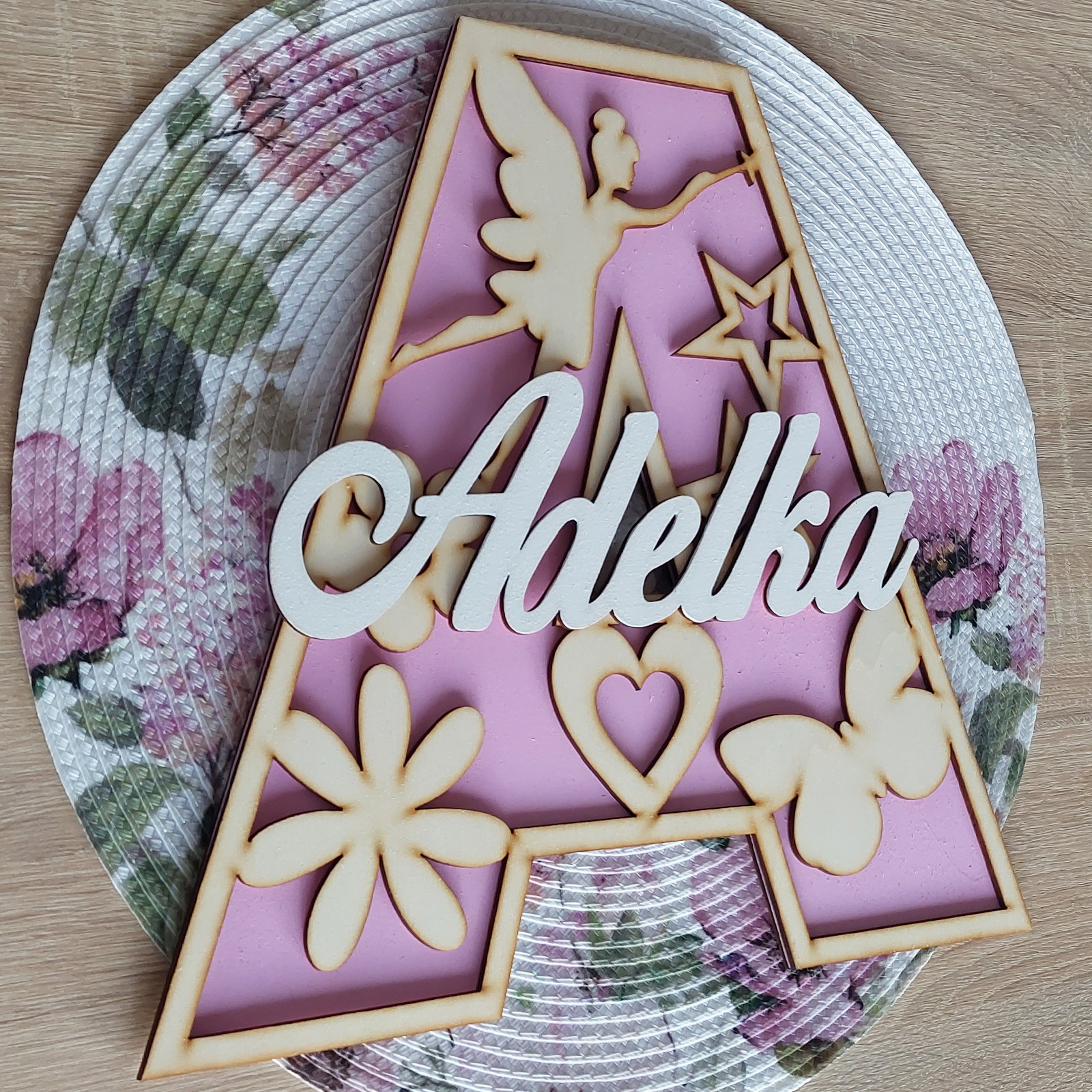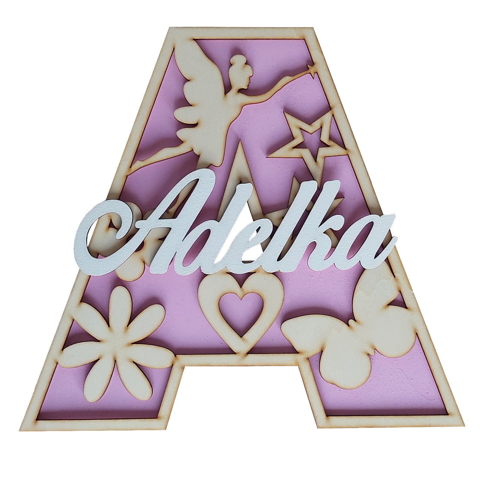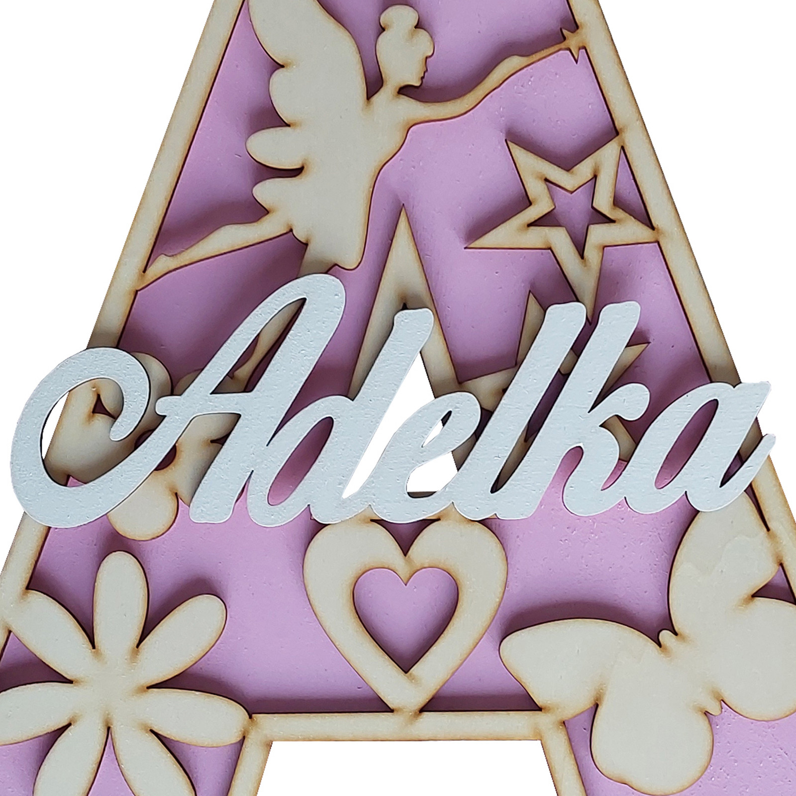 30 cm vysoké písmeno (počáteční písmeno jména vaší dcerky), které slouží jako podklad pro její vlastní malý svět. Na něm je vkusně umístěno jméno o výšce 8 cm, což vytváří krásný 3D efekt a hloubku.