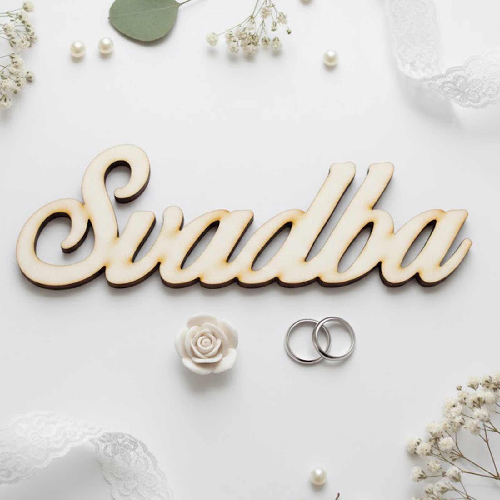Nápis SVATBA o rozměrech 50 x 145 mm je ideálním společníkem pro kreativní duše. Je vyroben z 3 mm topolové překližky, což mu dodává potřebnou pevnost, ale zároveň zůstává lehký a jemný na pohled. Přírodní světlá barva dřeva krásně ladí s krajkou, jutou i čerstvými květinami.