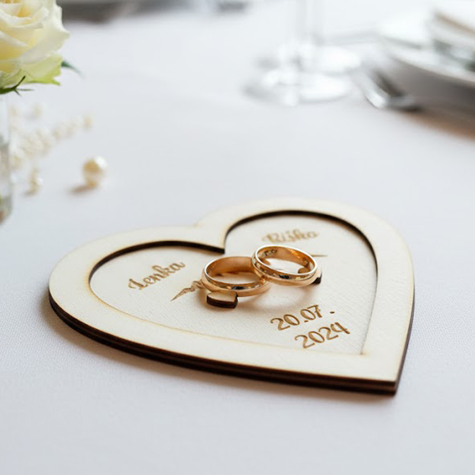 Existuje mnoho různých designů, jak ozdobit svatební talířek na svatební prstýnky s jmény. Můžete si ho nechat vyrobit na míru.