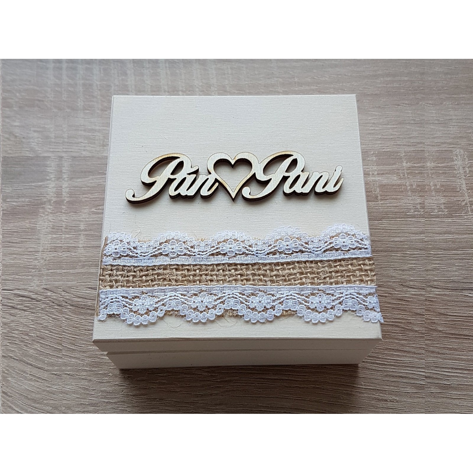 Na krabičce jsou přilepené vy-laserované Pan a Paní zdobené krajkou.
