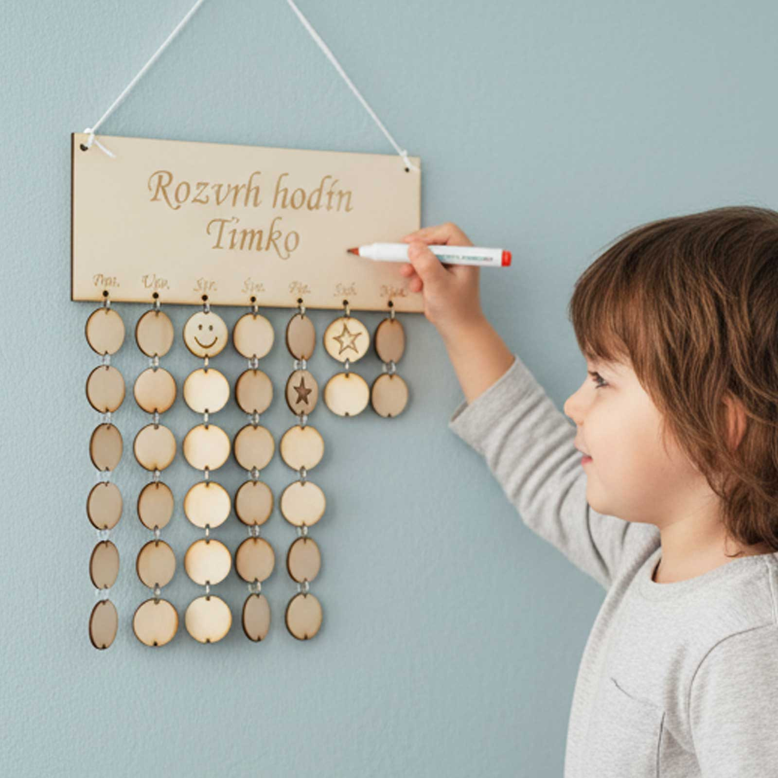 To, co činí tento rozvrh výjimečným, je možnost personalizace. Pomocí laseru vygravírujeme jméno vašeho dítěte (nebo jakýkoli jiný text) přímo na tabulku.