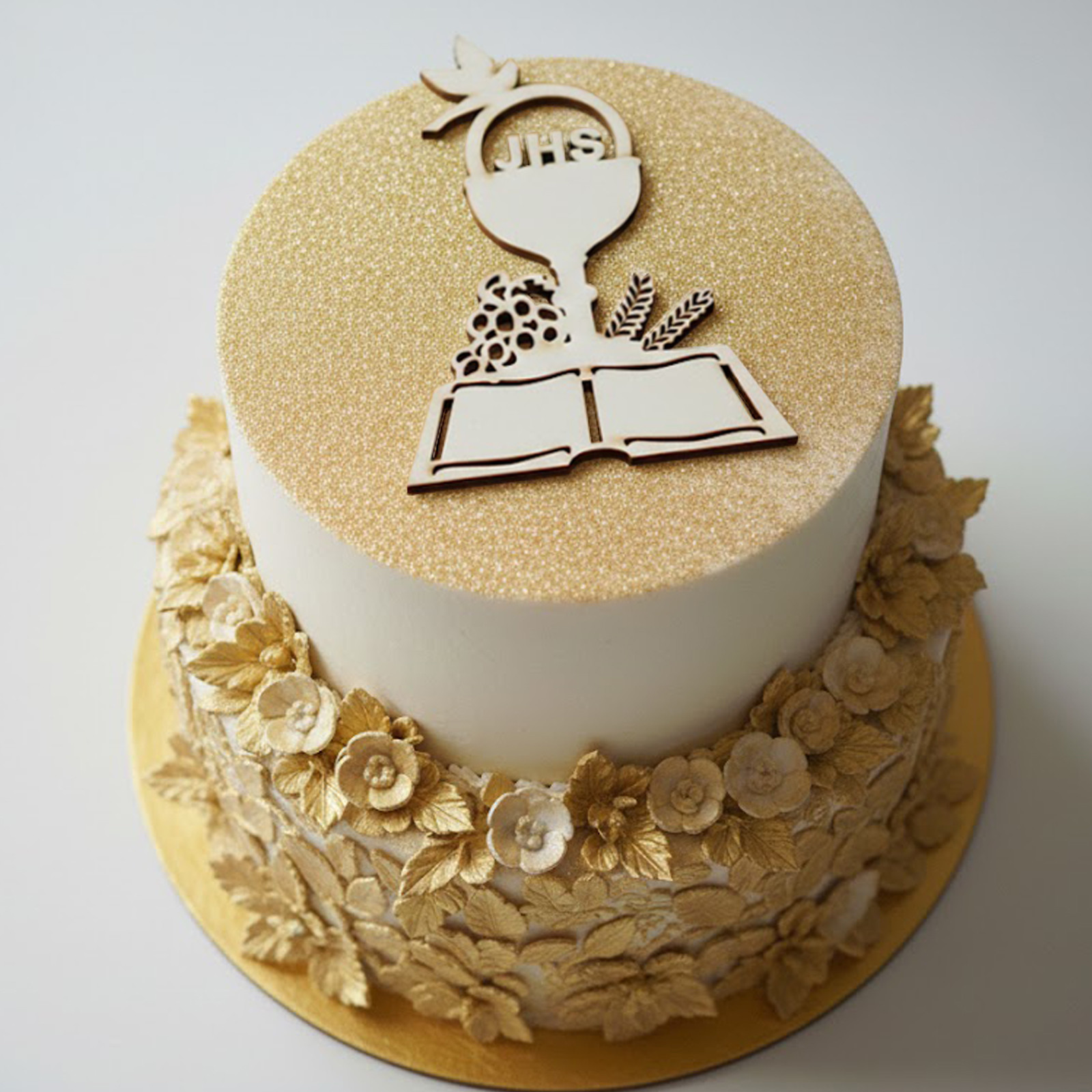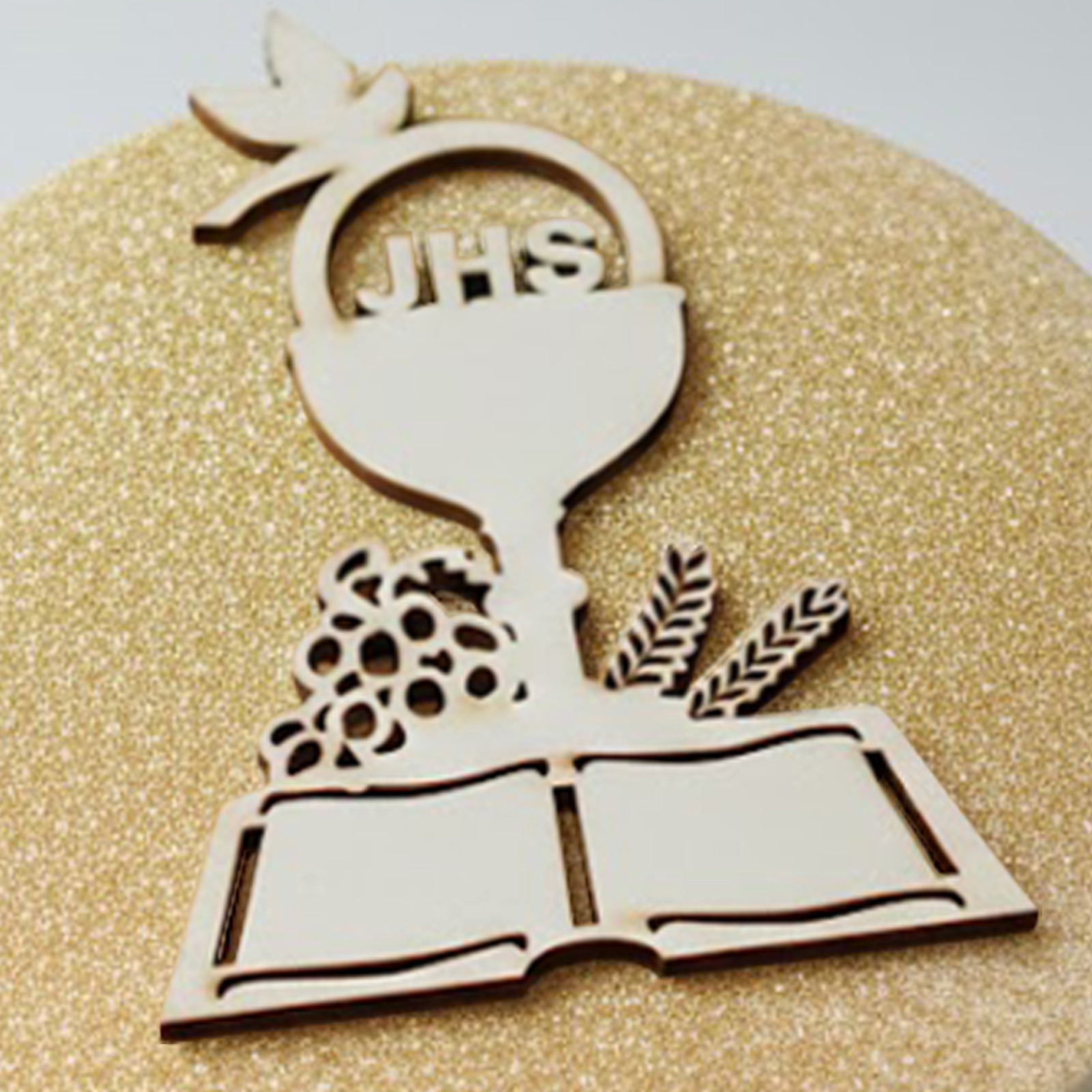 Jedná se o ručně vyrobenou dřevěnou dekoraci, která zobrazuje tradiční symboly křesťanství: kalich, hostii a hrozen. Tyto symboly jsou často spojeny se svátostí Eucharistie a představují Kristovu krev, jeho tělo a ovoce jeho oběti. Výřez je vyroben z přírodního materiálu - topolové překližky, což mu dodává rustikální a zároveň elegantní vzhled.
